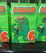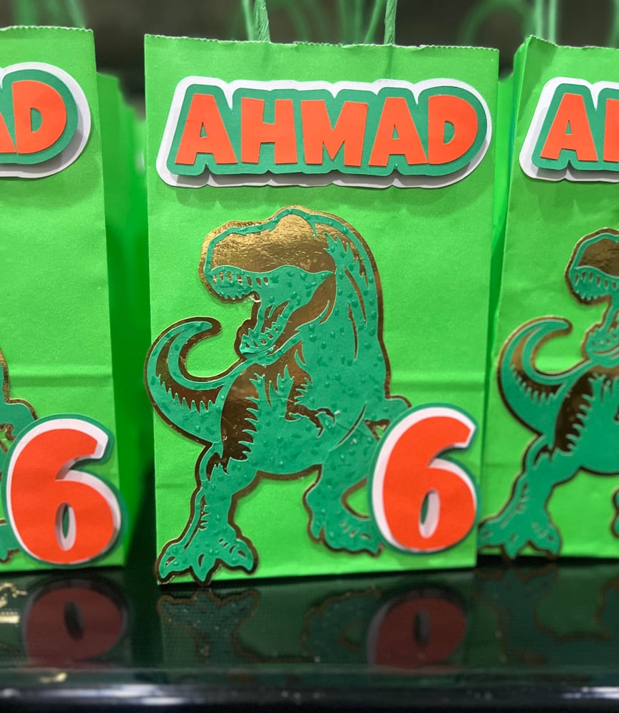 These 🦖Dinosaur party favor bags are made of paper and are approximately, 5.25 inches wide, and 8.38 inches tall. Any color/character of your choice can be done.